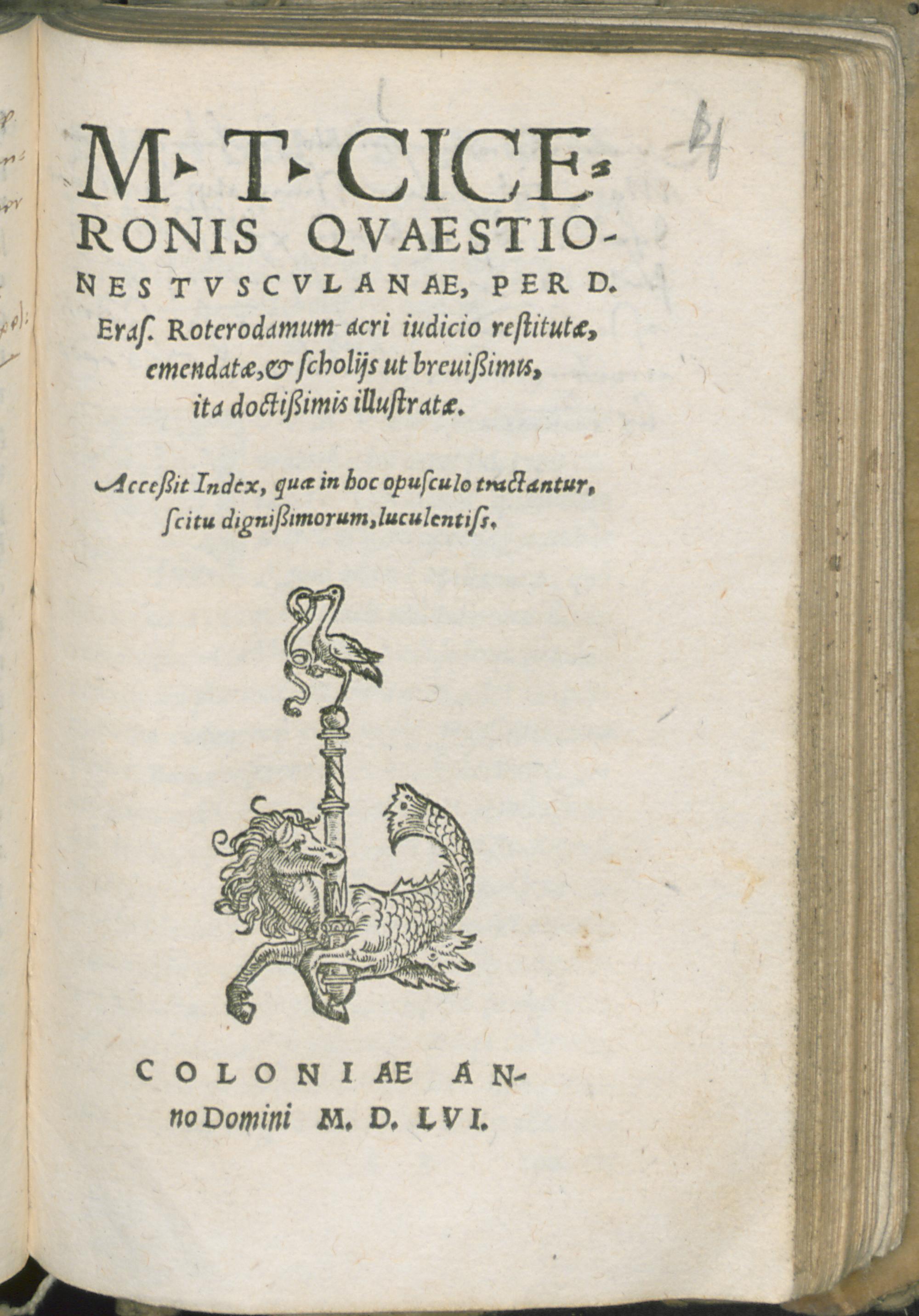 M. T. Ciceronis Quaestiones Tusculanae : Acc. index ... / per D. Eras. acri iudicio restitutae, emendatae, & scholiis ... illustratae