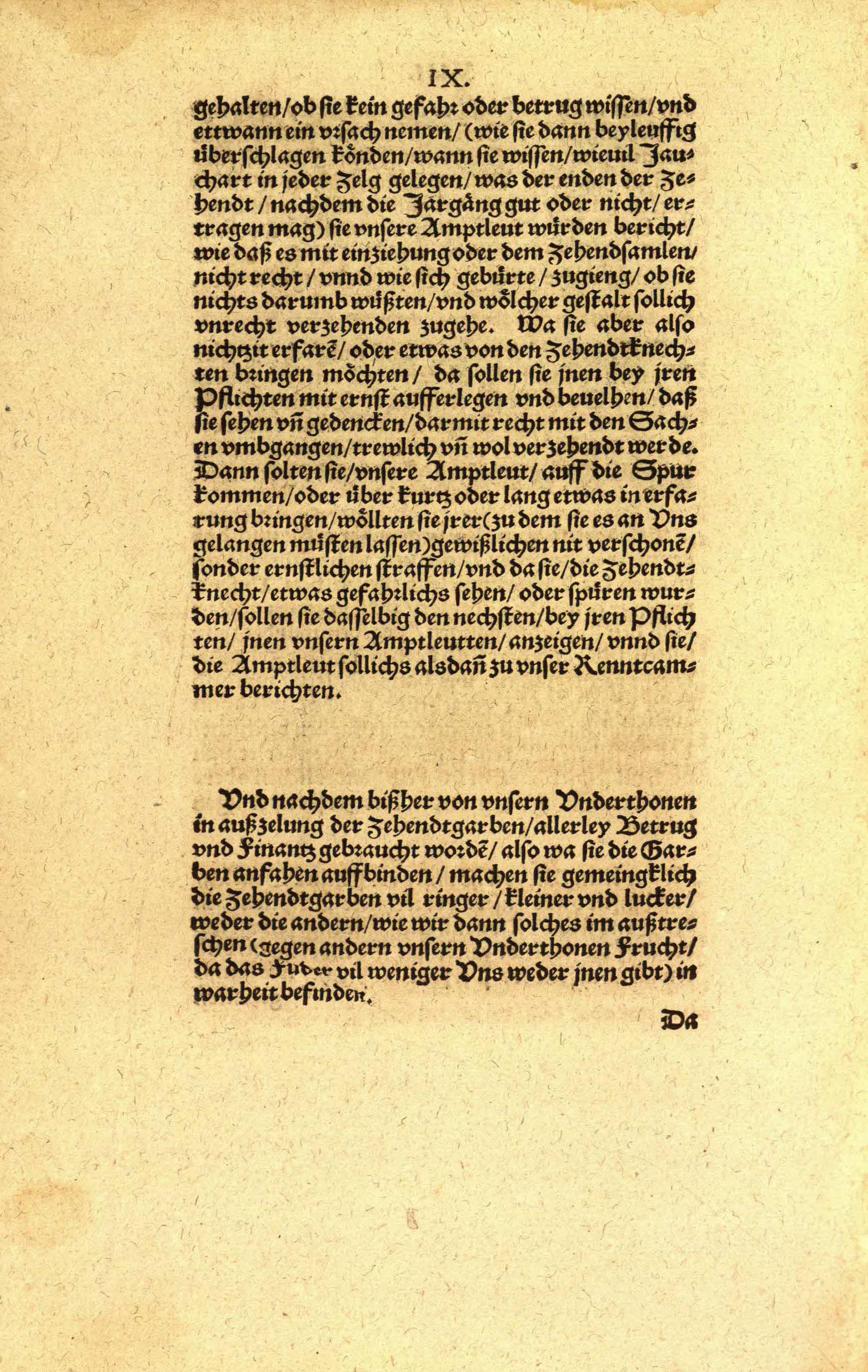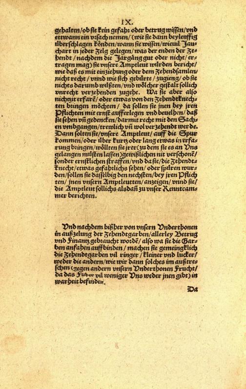 Instruction und Ordnung, wölchermassen sich hinfüro alle verrechnete Amptleut im Fürstenthumb Würtenberg, mit verleyhung unnd einsamlung der Zehendt, unnd aller anderer theilbarn Früchten, halten unnd in bessere Ordnung anstellen sollen, &c : [vom 29. Mai 1565] / [Urh.: Christoph Herzog von Wuerttemberg]