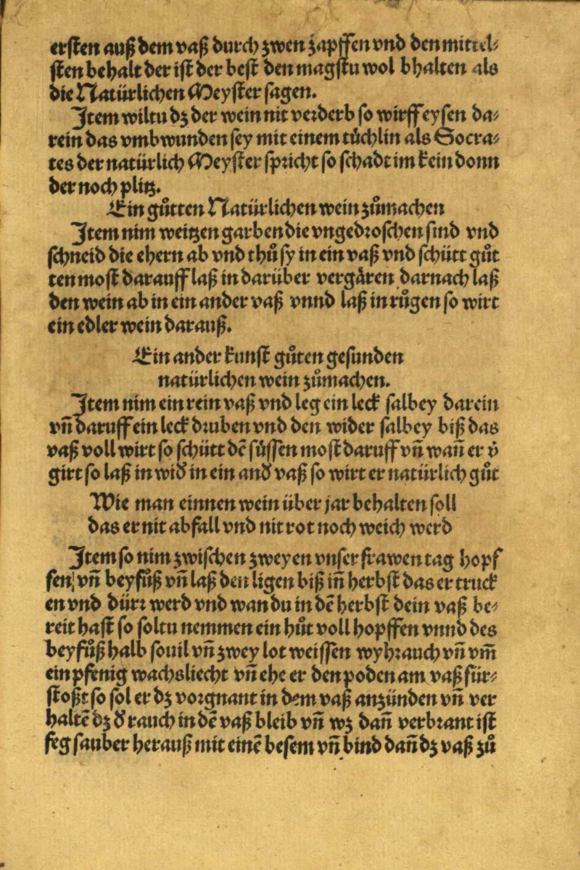 Das zehend Capitel. Leret wie mann guten natürlcihen süssen senfften milten wein soll machen ym herbst dz er dz gantz Jar also bleib
