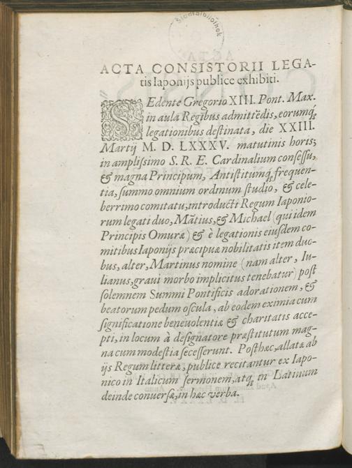 Acta consistorii publice exhibiti : a S.D. N. Gregorio Papa XIII. regum Japoniorum legatis Romae, die XXIII. Martii M.D.LXXXV