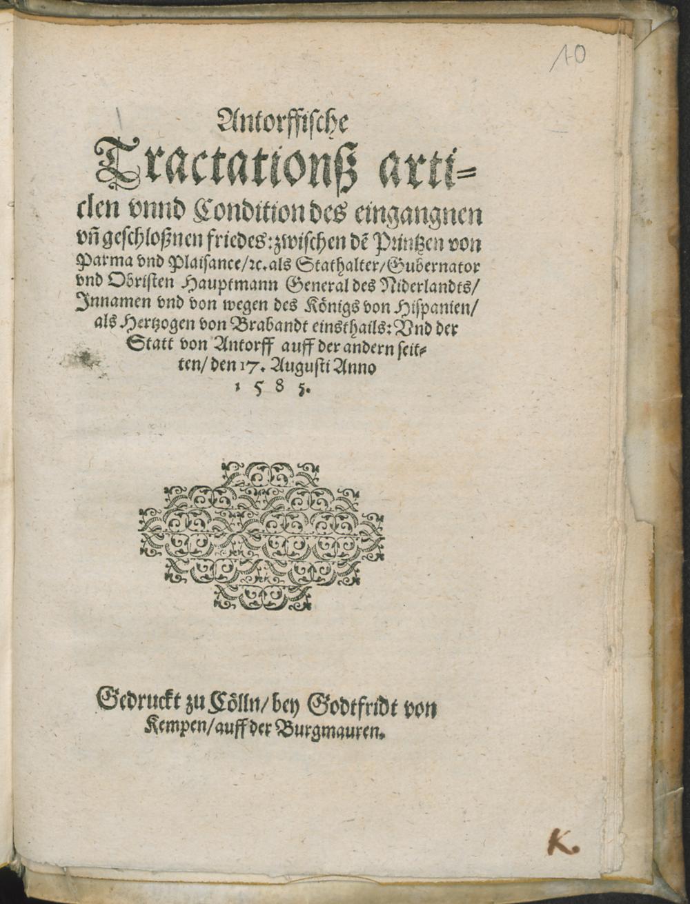 Antorffische// Tractationsz arti-//clen vnnd Condition des eingangnen// vn[d] geschloßnen friedes: zwischen de[m] Printzen von// Parma vnd Plaisance/ [et]c. als Stathalter/ Gubernator// vnd Obristen Hauptmann General des Niderlandts, Jnnamen vnd von wegen des Königs von Hispanien/ als Hertzogen von Brabandt einsthails: Vnd der// Statt von Antorff auff der andern seit-//ten/ den 17. Augusti Anno// 1585
