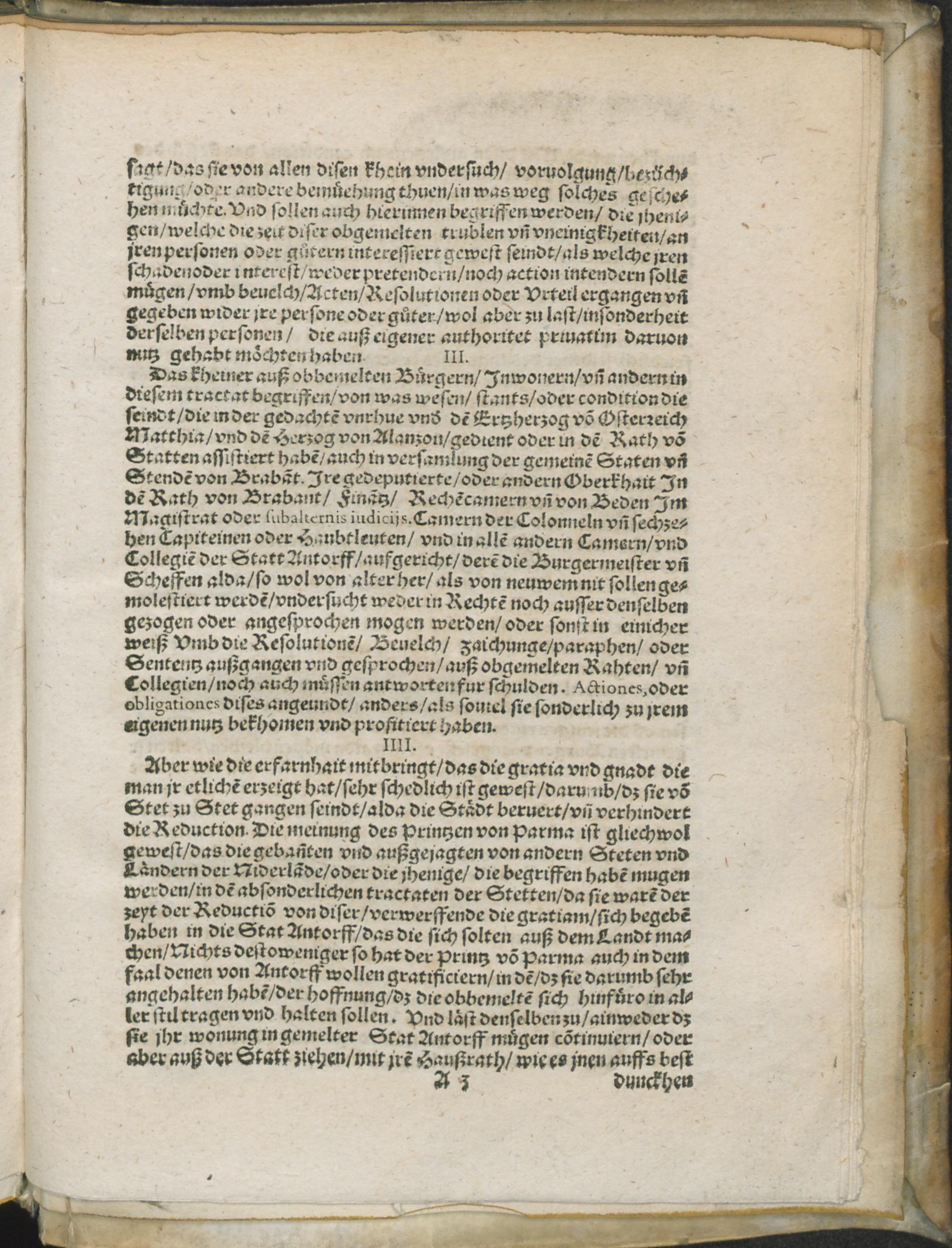 Antorffische// Tractationsz arti-//clen vnnd Condition des eingangnen// vn[d] geschloßnen friedes: zwischen de[m] Printzen von// Parma vnd Plaisance/ [et]c. als Stathalter/ Gubernator// vnd Obristen Hauptmann General des Niderlandts, Jnnamen vnd von wegen des Königs von Hispanien/ als Hertzogen von Brabandt einsthails: Vnd der// Statt von Antorff auff der andern seit-//ten/ den 17. Augusti Anno// 1585
