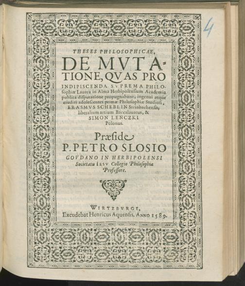 De mutatione / Petrus Slosius. [Resp.:] Erasmus Scheblin & Simon Lenczki