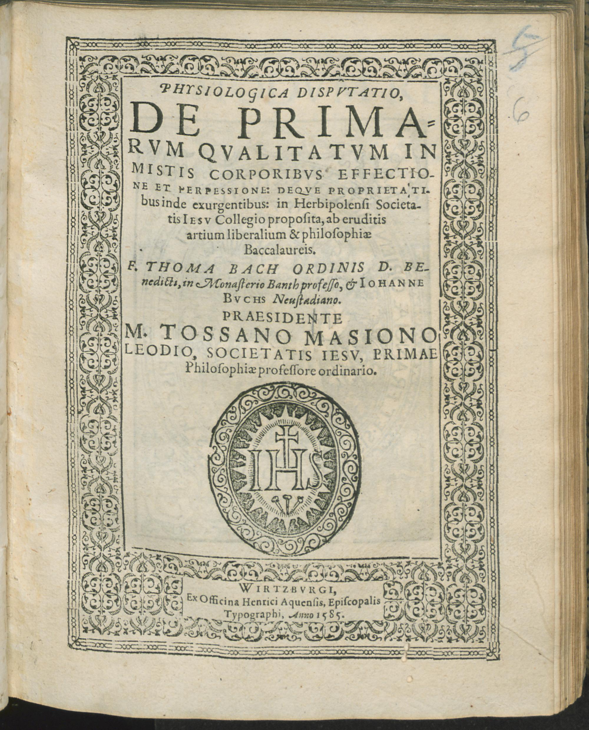 Physiologica disputatio, De primarum qualitatum in mistis corporibus effectione et perpessione deque proprietatibus inde exurgentibus / Tossanus Masionus. [Resp.:] Thomas Bach & Iohannes Buchs