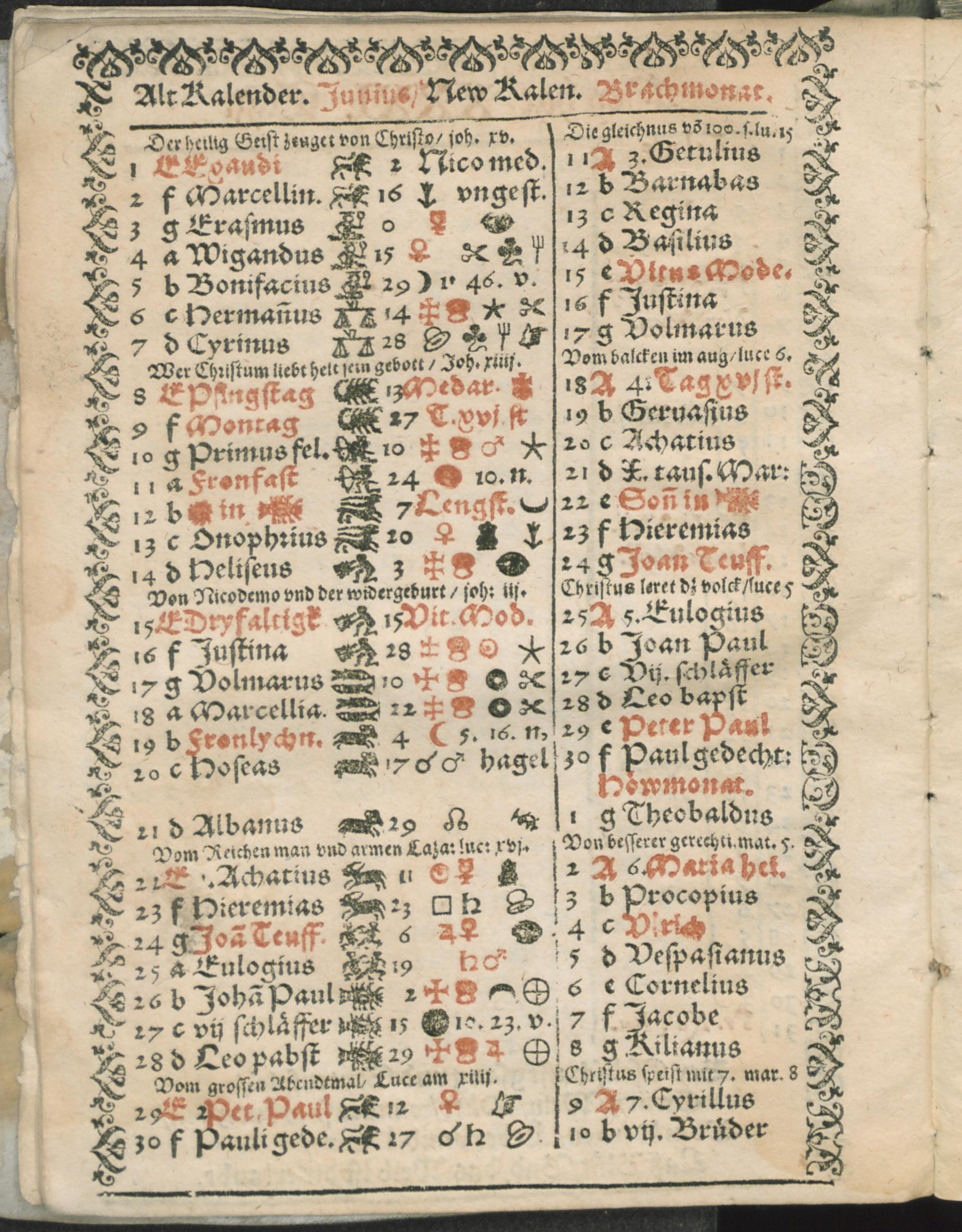 Alt Kalender. Junius/ New Kalen. Brachmonat.