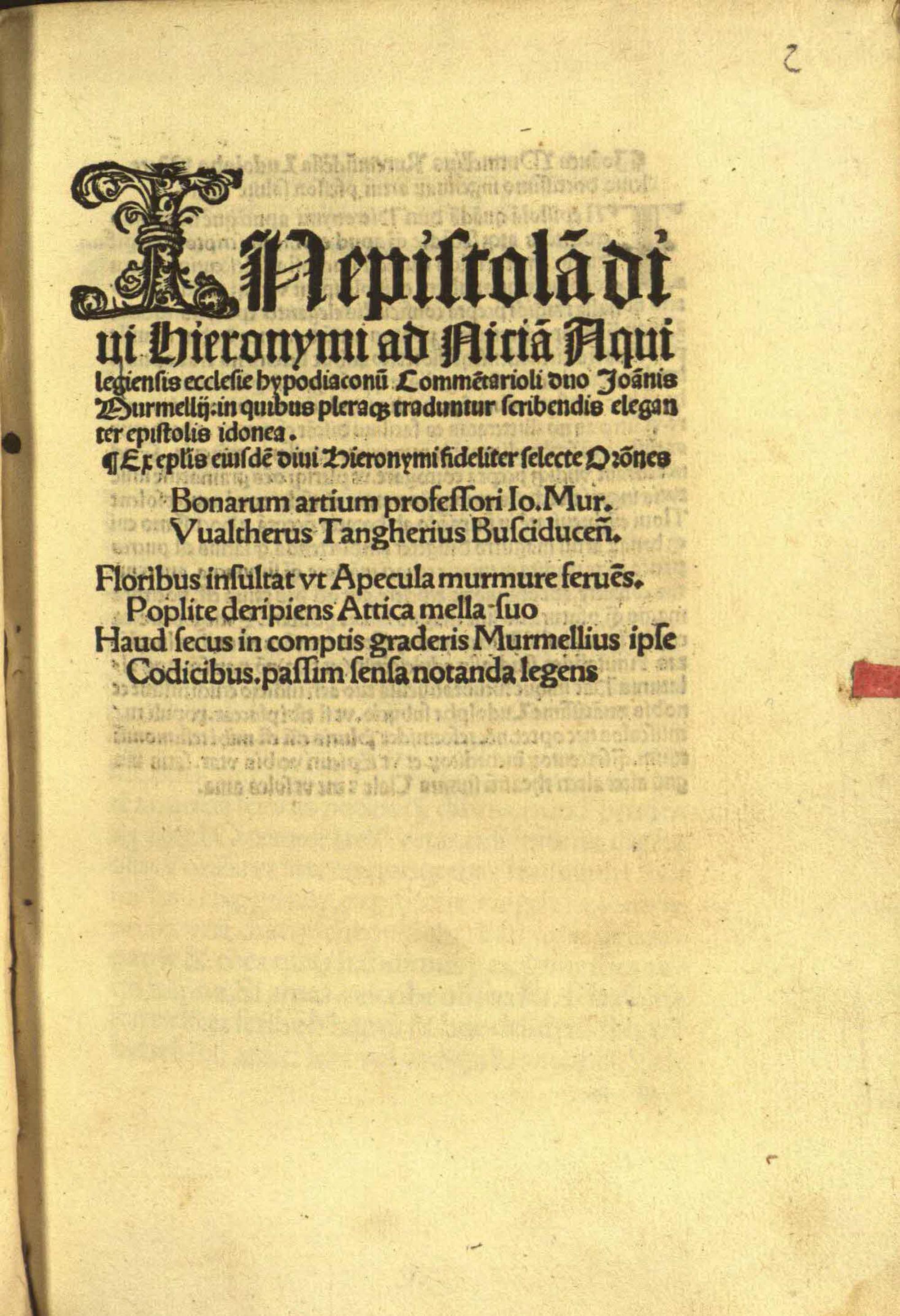 IN epistola[m] di//ui Hieronymi ad Nicia[m] Aqui//legiensis [!] ecclesie hypodiaconu[m] Comme[n]tarioli duo Joa[n]nis// Murmellij : in quibus pleraq[ue] traduntur scribendis elegan//ter epistolis idonea.// Ex ep[isto]lis eiusde[m] diui Hieronymi fideliter selecte Or[ati]ones// Bonarum artium professori Io. Mur.// Vualtherus Tangherius Busciducen[sis] ...