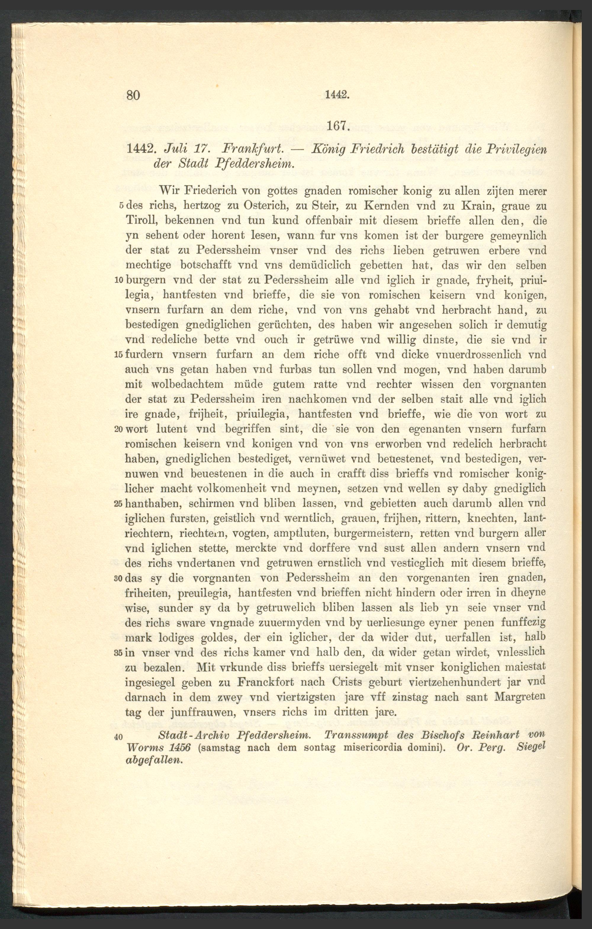 Urkundenbuch der früheren freien Reichsstadt Pfeddersheim