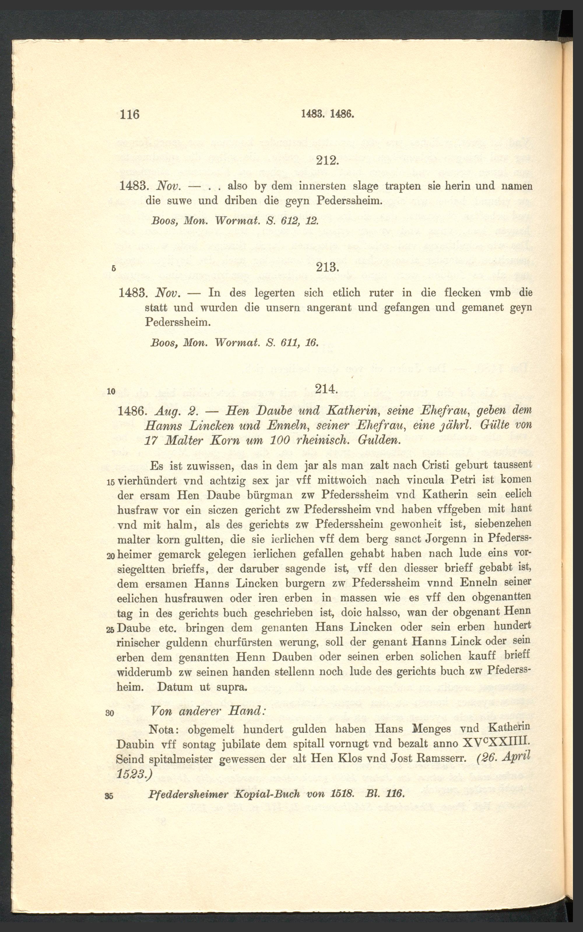 Urkundenbuch der früheren freien Reichsstadt Pfeddersheim / ... hrsg. durch Daniel Bonin