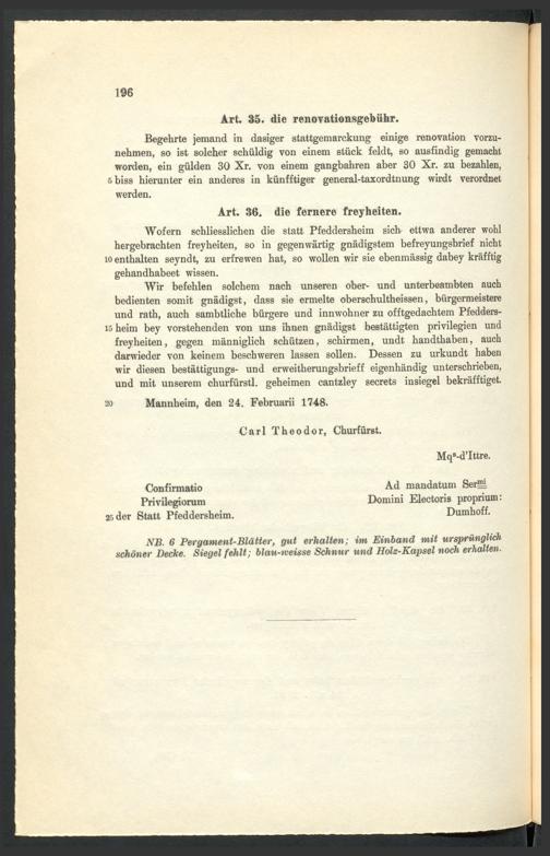 Confirmatio Privilegiorum der Stadt Pfeddersheim durch den Kurfürsten Carl Theod...