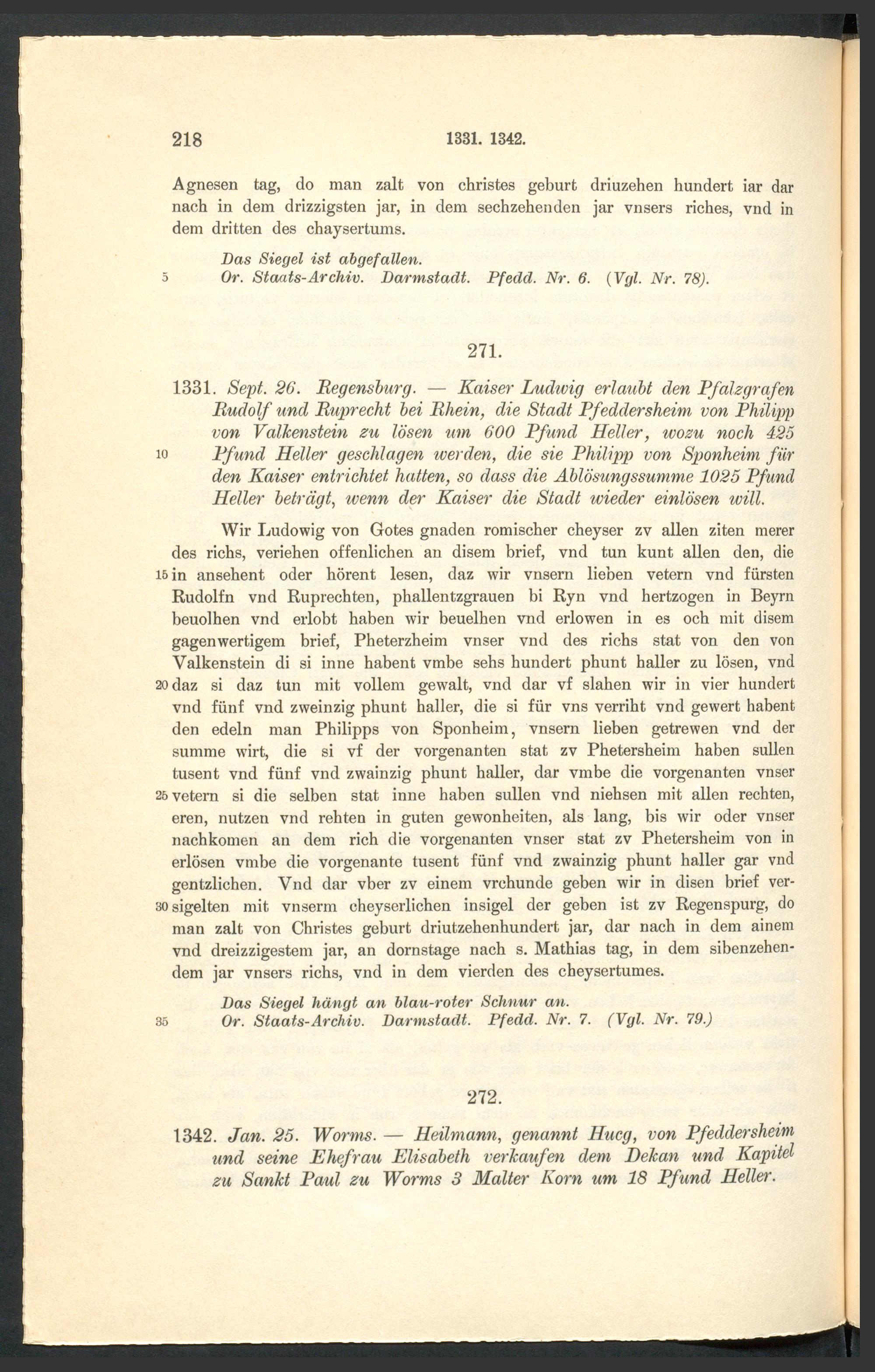 Urkundenbuch der früheren freien Reichsstadt Pfeddersheim