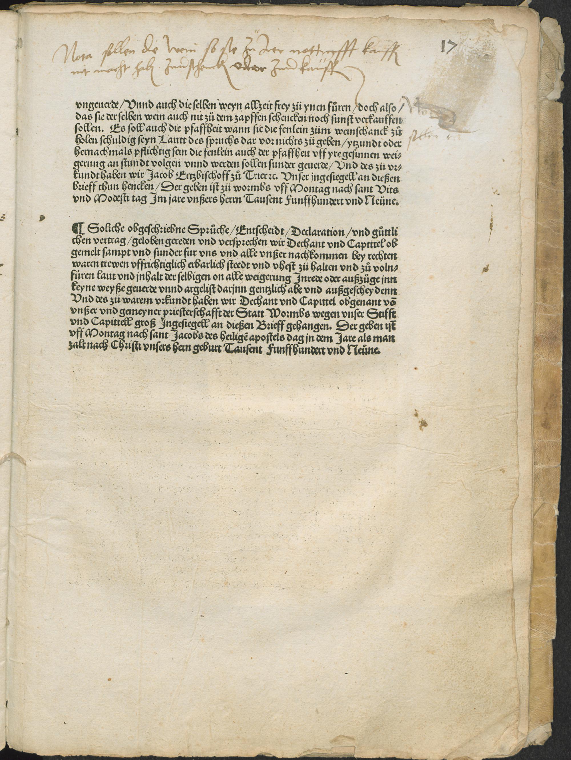Entscheidt vnd vertrege zwischenn der pfaffheidt vnd gemeyner Statt wormbs des weynschenckens vnd anderer stuck halber [et]c.