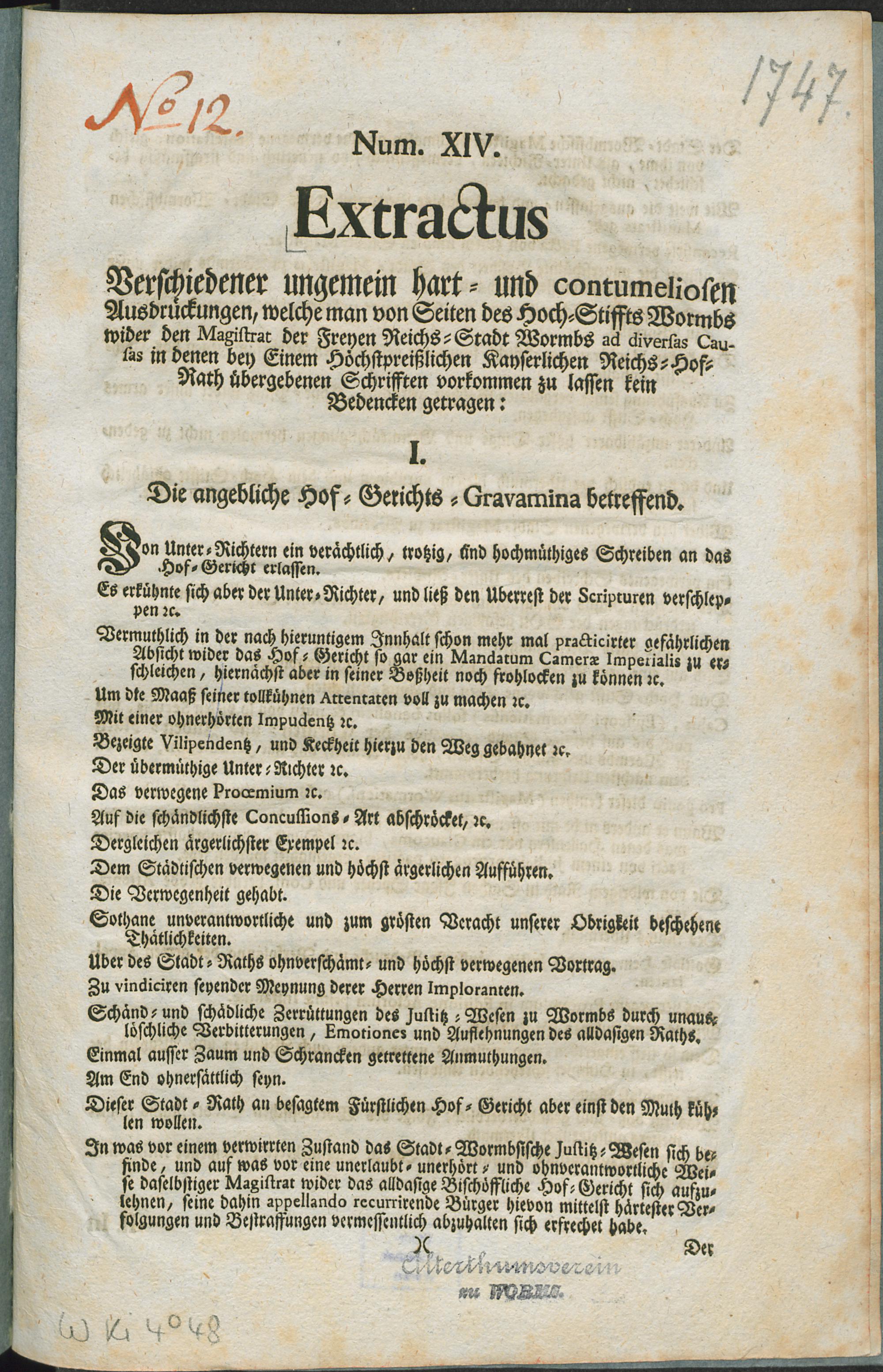 Extractus : Verschiedener ungemein hart- und contumeliosen Ausdrückungen, welche man von Seiten des Hoch-Stiffts Wormbs wider den Magistrat der Freyen Reichs-Stadt Wormbs ad diversas Causas in denen bey Einem Höchstpreißlichen Kayserlichen Reichs-Hof-Rath übergebenen Schrifften vorkommen zu lassen kein Bedencken getragen