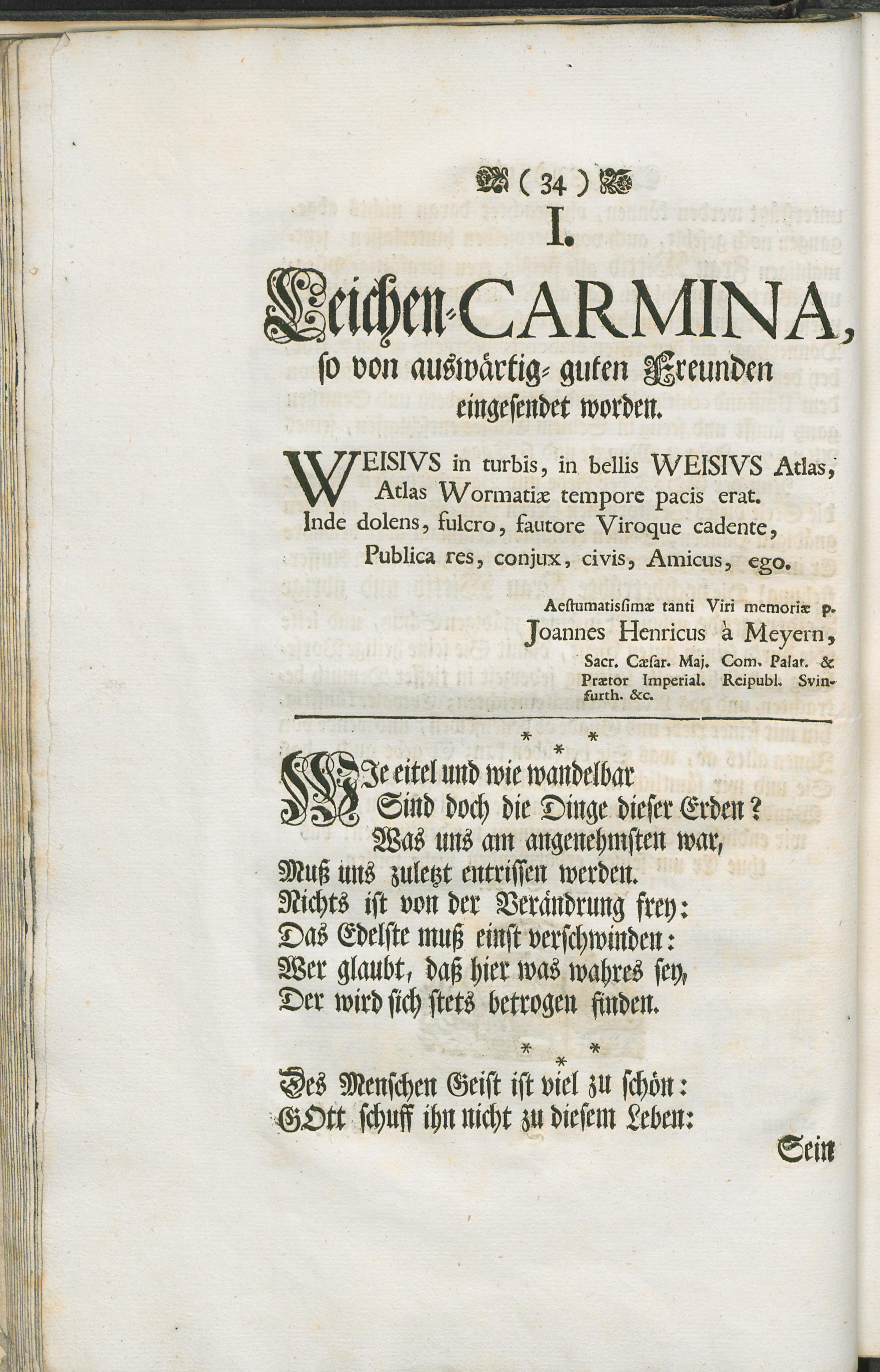 Der Gläubigen Seelige Beständigkeit an dem Herrn ihrem Gott, wurde bey Hochansehnlicher Leiche-Begängniß. Des Weyland Hoch-Edelgebohrnen, Gestrengen, und Hochgelahrten Herrn Elias Christoph Weise, Wohlregierenden Herrn Stättmeisters, Hochverdienten Raths-Senioris, des Consistorii, Scholarchats, und Rechenstuben Directoris, und derer übrigen Corporum Ober-Inspectoris, Welcher, nach ausgestandener langwierigen Kranckheit, Den 28. Decembr. 1747. das Zeitliche mit dem Ewigen verwechselt, und den folgenden 31. ejusd. in die allhiesige Neue Kirche, zur Heiligen Dreyfaltigkeit genannt, zu Seinem Grabe, und Ruhe-Statt gebracht worden, Aus dessen selbst erwehlten, und verordneten Leichen-Text Ps. 73, 23, 24. einer Volckreichen Christlichen-Versammlung vorgestellet / von Gustav Friederich Beer
