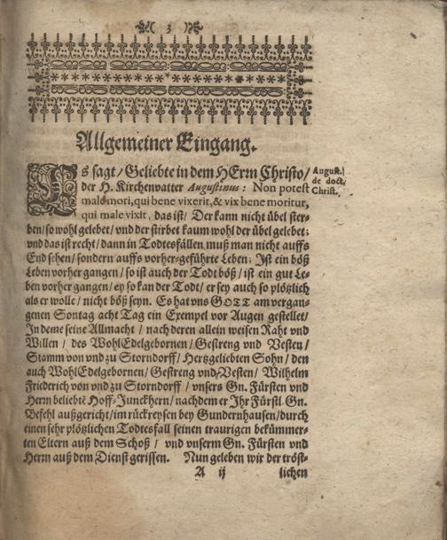 Noli Gloriari In Crastinum, Christliche Leichpredigt Auß den Worten Salomonis beschrieben Prov. 27. V I. Rühme dich nicht des Morgenden Tags etc. Bey der Volckreichen vnd Ansehnlichen Leichbegängnuß Des Weyland WohlEdelgebornen, Gestreng vnd Vesten Wilhelm Friderichs von vnd zu Storndorff, Gewesenen Fürstlichen Hessen Darmbstattischen Hoff-Junckhern, Welcher den 19. Tag Junii 1656, nach Verrichtung Fürstlicher Geschäfften, bey Gundernhausen mit dem Pferd gestürzt, vnd noch selbigen Abend kurz vor 10. Uhr daselbst verschieden, auch folgends den 9. Tag Julii zu Darmbstatt Christlich zur Erden bestattet worden. / Gehalten in der Statt-Kirchen... Durch M. Johannem Christianum Wentzium, Statt-Predigern daselbst
