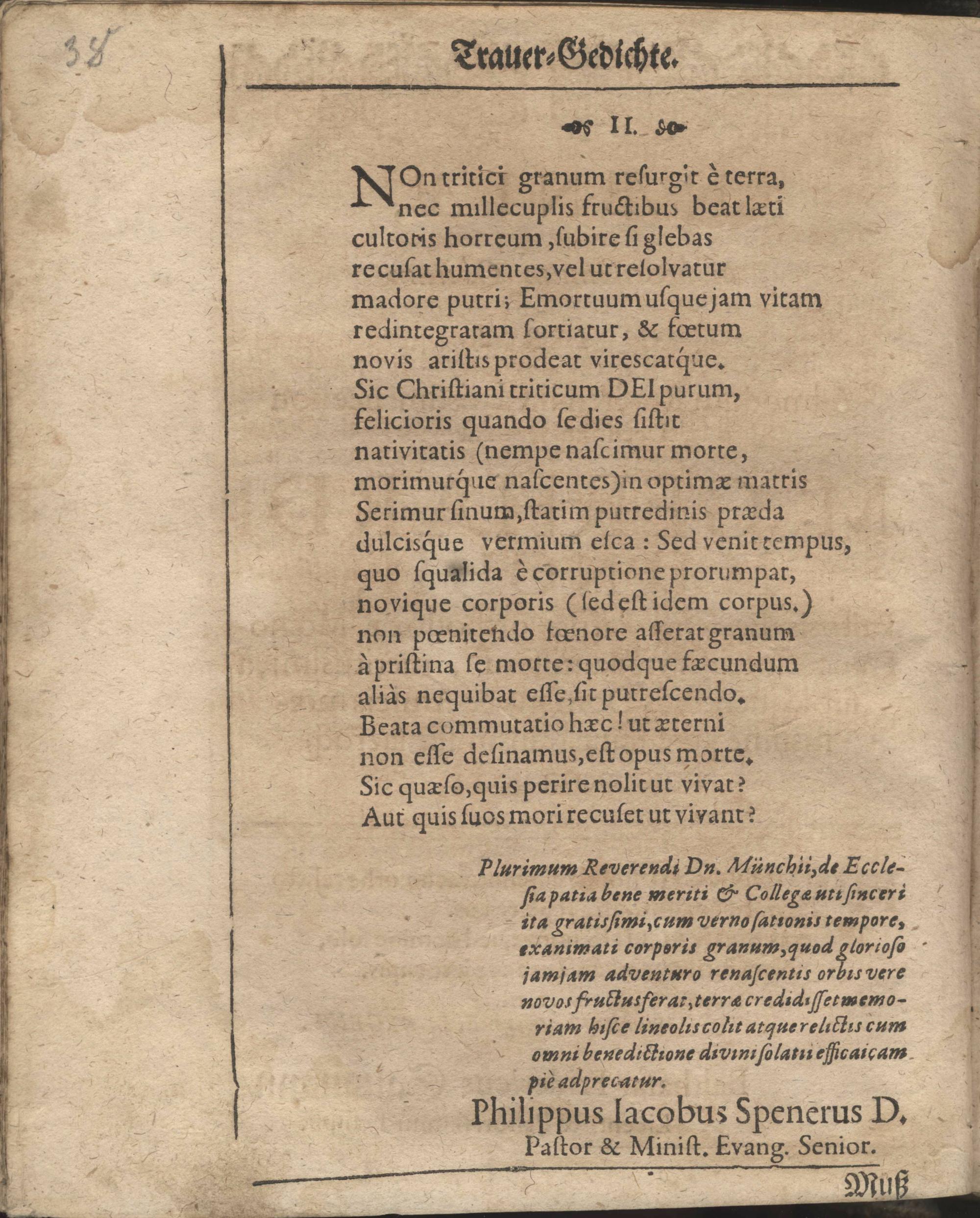 Aller Menschen Nichtigkeit Auß den Worten Davids Psa. XXXIX, 12. Ach wie gar nichts sind doch alle Menschen. Sela. Bey Ansehnlicher und Volckreicher Leichbegängnüß Deß weyland Wohl-Ehrwürdigen, Andächtigen und Wohlgelährten Herrn Gerhardi Münchs, Treugewesenen Evangelischen Predigers, dieser des H. Reichs-Stadt Franckfurth am Mäyn Christseligen Andenckens, Welcher am 11. Martii dieses lauffenden 1671. Jahrs diese Nichtigkeit verlassen, und am folgenden 14. ejusdem auff dem Gottes-Acker zu S. Peter mit Christgewöhnlichen Ceremonien beerdiget worden. / In der Kirchen zu St. Peter der daselbst versamlet gewesenen Christlichen Gemeinde vor Augen gestellt Von Johanne Emmeln, Evangel. Predigern allhier.