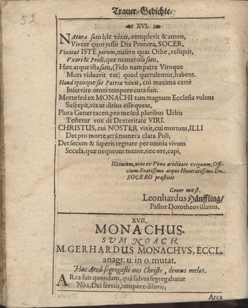 Aller Menschen Nichtigkeit Auß den Worten Davids Psa. XXXIX, 12. Ach wie gar nichts sind doch alle Menschen. Sela. Bey Ansehnlicher und Volckreicher Leichbegängnüß Deß weyland Wohl-Ehrwürdigen, Andächtigen und Wohlgelährten Herrn Gerhardi Münchs, Treugewesenen Evangelischen Predigers, dieser des H. Reichs-Stadt Franckfurth am Mäyn Christseligen Andenckens, Welcher am 11. Martii dieses lauffenden 1671. Jahrs diese Nichtigkeit verlassen, und am folgenden 14. ejusdem auff dem Gottes-Acker zu S. Peter mit Christgewöhnlichen Ceremonien beerdiget worden. / In der Kirchen zu St. Peter der daselbst versamlet gewesenen Christlichen Gemeinde vor Augen gestellt Von Johanne Emmeln, Evangel. Predigern allhier.