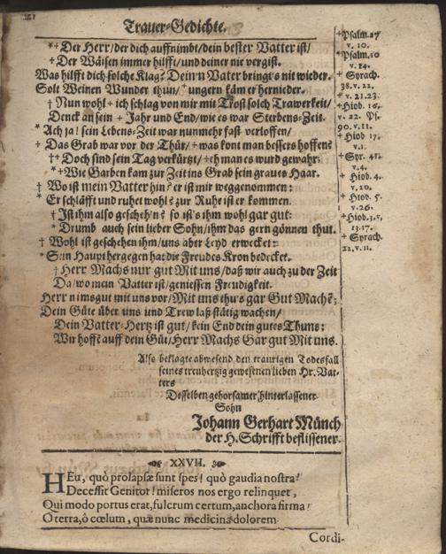 Aller Menschen Nichtigkeit Auß den Worten Davids Psa. XXXIX, 12. Ach wie gar nichts sind doch alle Menschen. Sela. Bey Ansehnlicher und Volckreicher Leichbegängnüß Deß weyland Wohl-Ehrwürdigen, Andächtigen und Wohlgelährten Herrn Gerhardi Münchs, Treugewesenen Evangelischen Predigers, dieser des H. Reichs-Stadt Franckfurth am Mäyn Christseligen Andenckens, Welcher am 11. Martii dieses lauffenden 1671. Jahrs diese Nichtigkeit verlassen, und am folgenden 14. ejusdem auff dem Gottes-Acker zu S. Peter mit Christgewöhnlichen Ceremonien beerdiget worden. / In der Kirchen zu St. Peter der daselbst versamlet gewesenen Christlichen Gemeinde vor Augen gestellt Von Johanne Emmeln, Evangel. Predigern allhier.