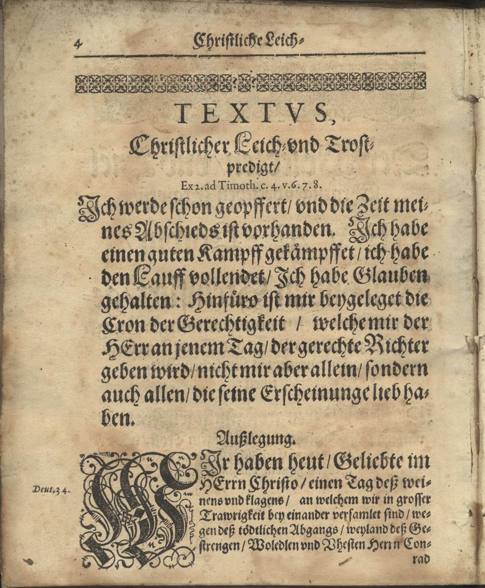 Vale Pavlinvm: Das ist: Gottselige Betrachtung und Erklärung der Leichpredigt, so S. Paulus, der Heyden Doctor, ihme selbst zu Rom im Gefängnüß gehalten, und seinem Jünger Timotheo ... schrifftlich ubersendet ... Bey hochansehnlicher Volckreicher Begräbnuß, Weyland deß Gestrengen, Wol-Edlen, vnd Vhesten Herrn Conrad Löwen, Von und zu Steinfurt, BurgkGraffens zur Reichs Burgk und Stadt Friedberg, Christseeliger Gedächtnuß. Welcher Sonnabends, den 17. Tag Mart. dieses 1632. Jahrs ... zu Steinfurt ... entschlaffen, und folgends daselbst den 5. Tag Aprilis ... zur Erden bestattet worden. / Gehalten ... Von Cratone Eobaldo, Pfarrern und Dienern am Wort Gottes zur Burgk Friedberg