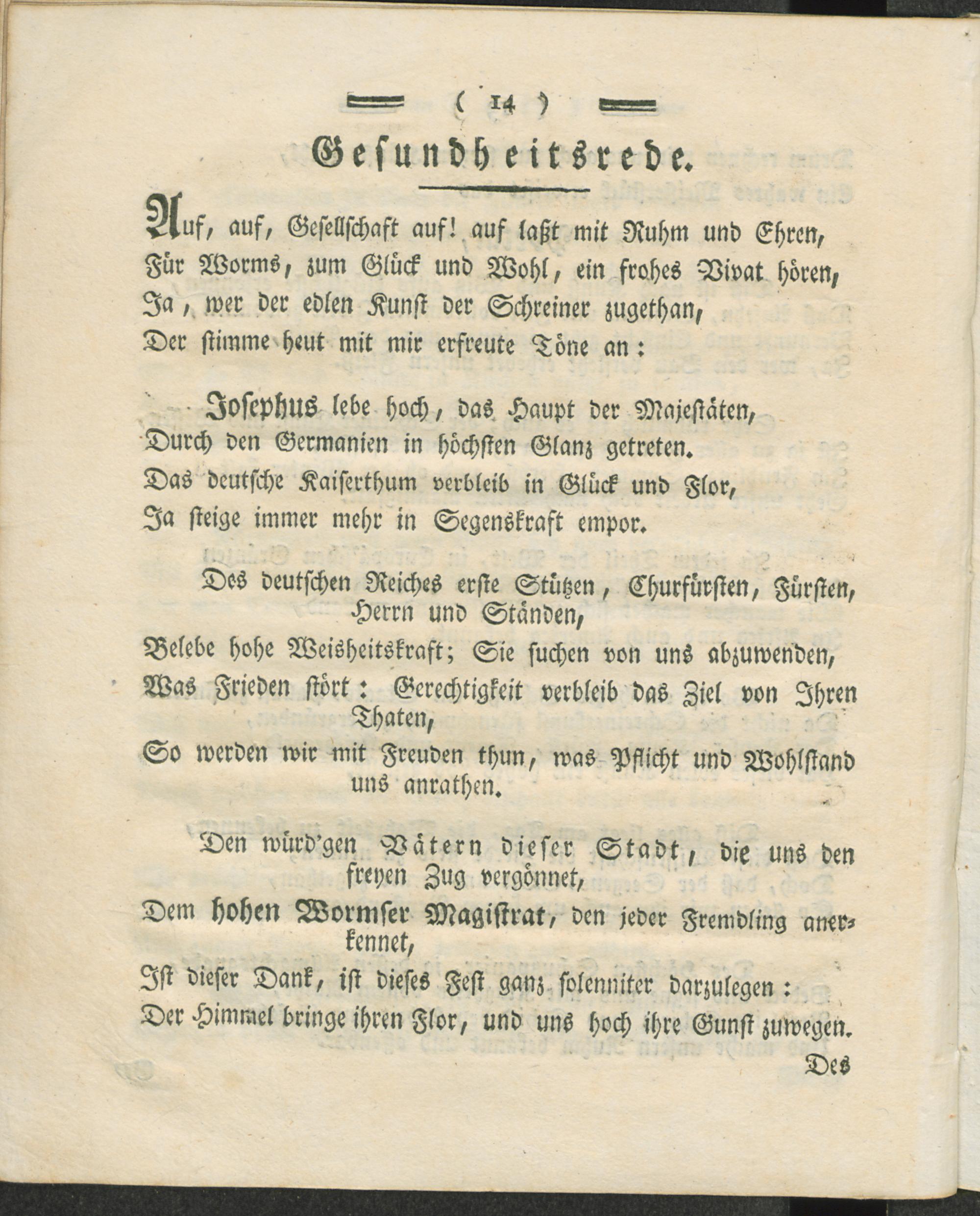 Ehrenvolles Denkmal bey Gelegenheit des gnädig erlaubten Aufzugs der löblichen Schreiner-Gesellschaft in der des Heil. Römischen Reichs freyen Stadt Worms bey der am 1ten September 1788 beschehenen Erneuerung des Herbergschildes.
