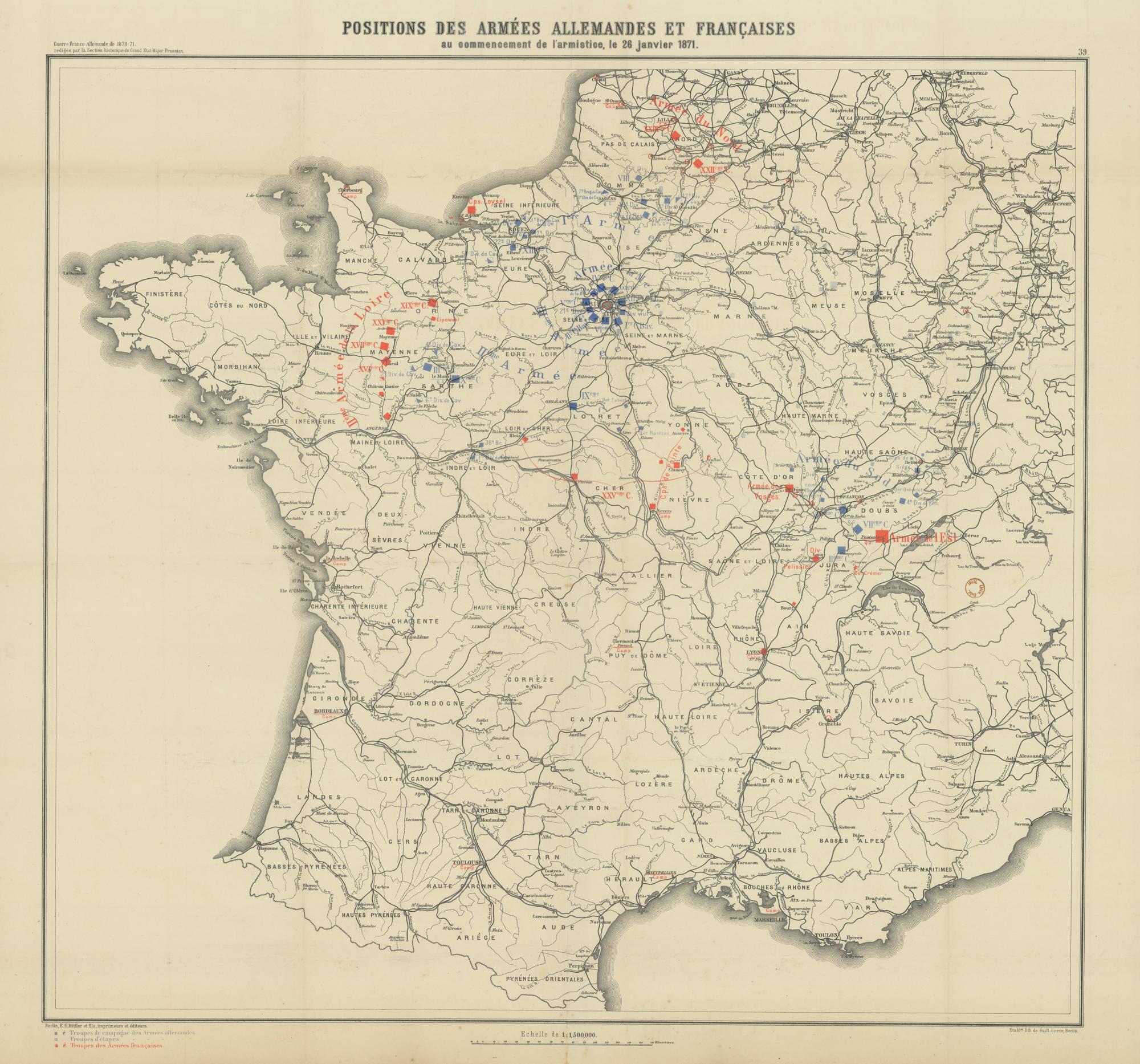 Positions des armées Allemandes et Françaises au commencement de l'armistice, le 26 janvier 1871 / Etablnt. lith. de Guill. Greve, Berlin.