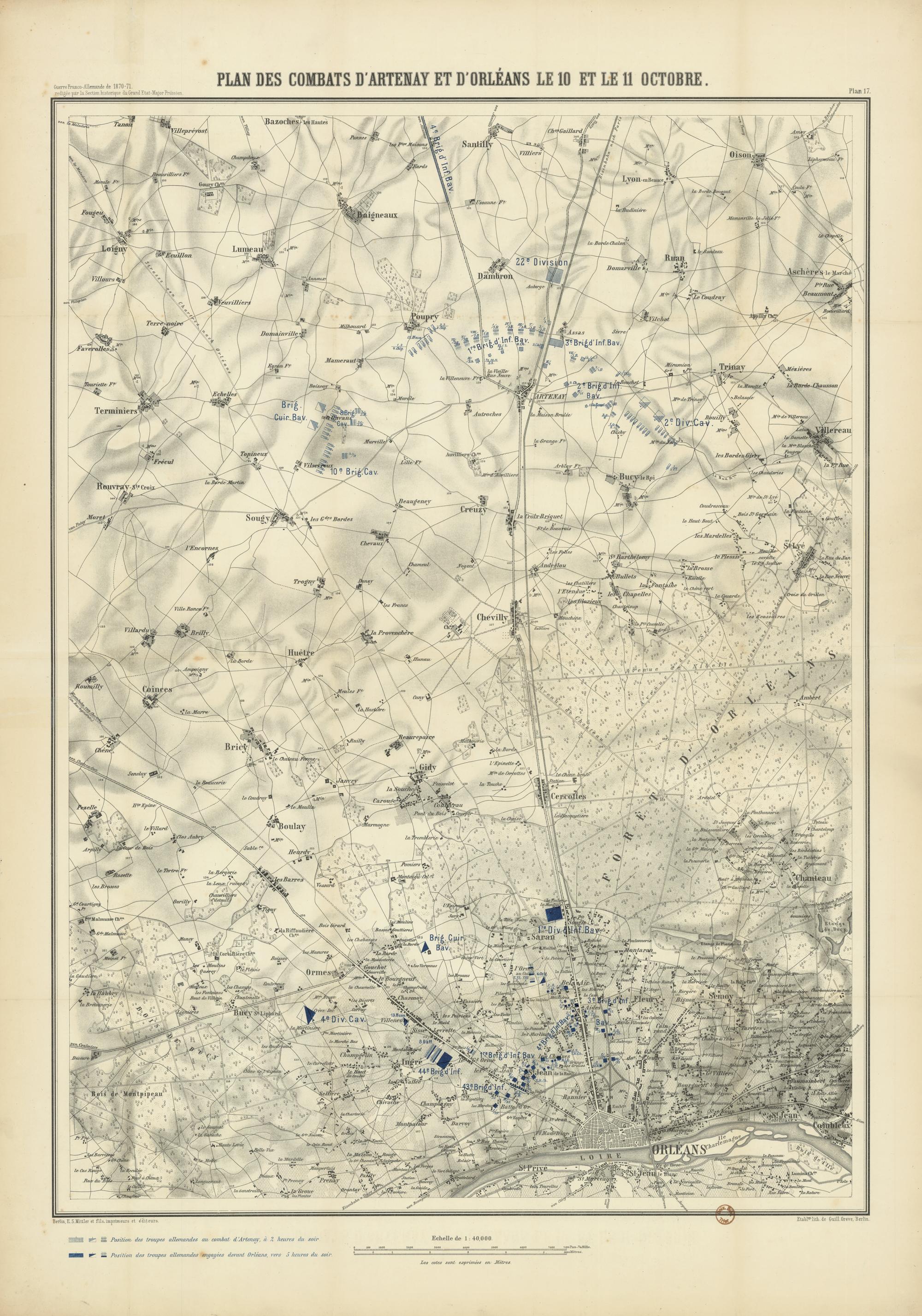 Plan des combats d'Artenay et d'Orléans le 10 et le 11 octobre / Etablnt. lith. de Guill. Greve, Berlin.