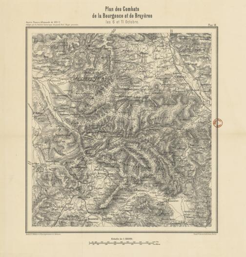 Plan des combats de la Bourgonce et de Bruyères les 6 et 11 octobre / Etablent. lith. de Guill. Greve, Berlin.