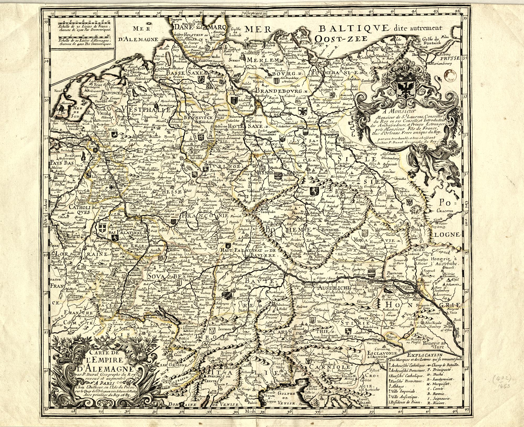Carte De L'Empire D'Alemagne : A Monsieur Monsieur de St. Laurens, Conseiller du Roy en ses Conseils, et Introducteur des Ambassadeurs, et Princes Estrangers prés Monsieur Fils de France, Duc d'Orleans, Frere unique de Roy, par son tres-humble et tres-obeissant serviteur. P. Duval Geographe du Roy / par P. Duval Geographe du Roy, reveuë et augmentée