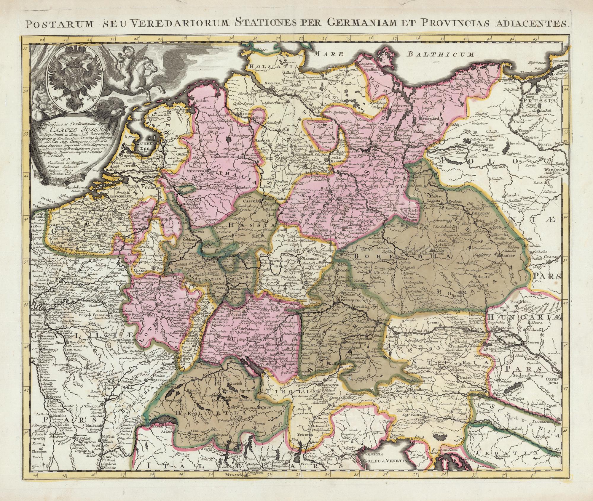 Postarum Seu Veredariorum Stationes Per Germaniam Et Provincias Adiacentes : Illustrissimo ac Excellentissimo Domino Dno Carolo Josepho S. R. Imp. Comiti a Paar, Lib. Baroni in Hartberg et Krottenstein, Domino in Fürstenfeld, Sac. Caes. Maj. Camerario, Consiliario Iutimo Supremæ Imperialis Aulæ Regnorum Hæreditariorum et Provinciarum Generali Hæreditario Postarum Magistro Domino mihi Gratioso. D.D. Humillimus ac devotissimus Petrus Schenck Sculptor Regis Poloniae. C.P