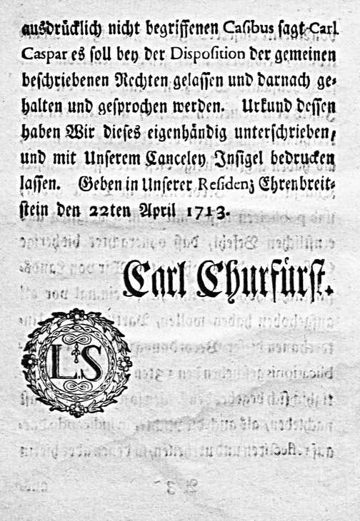 Erneuert- und vermehrtes Land-Recht des Erz-Stifts Trier : durch den Hochwürdigst-Durchlauchtigsten Herrn Herrn Carl Erzbischof Zu Trier, Des H. Römischen Reichs durch Gallien und des Königreichs Arelaten Erzcanzler und Churfürst, Bischof zu Osnabrück, Administrator zu Prüm, Herzog zu Lotharingen und Baar, des Ritterlichen Maltheser-Ordens in Castilien und Legion Groß Prior &c. Aufgericht im Jahr 1713