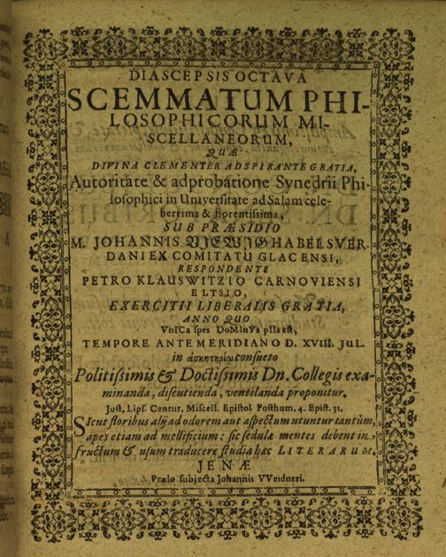 Diascepsis Octava Scemmatum Philosophicorum Miscellaneorum / sub praesidio Johannis Viewig Habelsverdani ... Respondente Petro Klauswitzio Carnoviensi Elysio