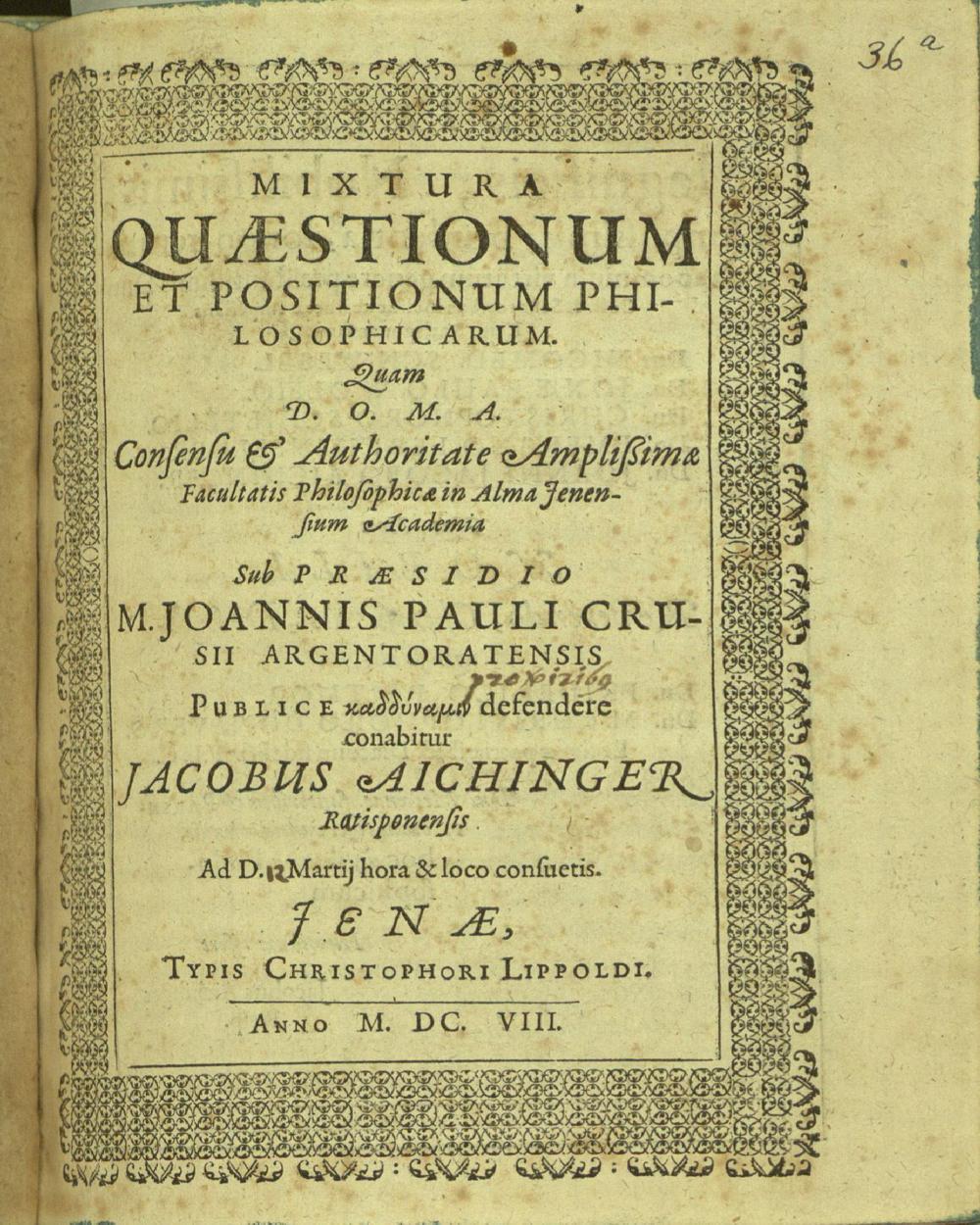 Mixtura quaestionum et positionum philosophicarum / ... sub praesidio Joannis Pauli Crusii ... conabitur Jacobus Aichinger
